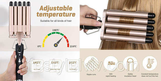 Плойка п'ять хвиль надає вам можливість різноманітного укладання волосся. Користуватися таким інструментом легко та безпечно. Ви можете з її допомогою створити розкішні хвилі або пишну шапку кучериків. Витратьте лише кілька хвилин на укладання, закріпіть її крапелькою лаку або гелю, і у вас буде зачіска на заздрість будь-якій голлівудській зірці.