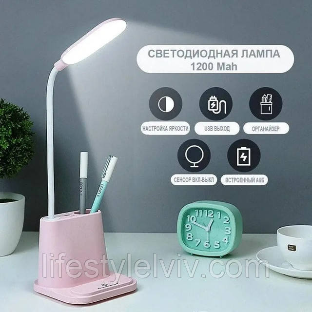 Величезною перевагою моделі є можливість її використання як павербанк для зарядки інших портативних девайсів. Функціонал лампи доповнюють зручний органайзер для ручок та невелике вилучення-підставка для телефону. Світильник має компактні розміри, тому не займає багато місця на робочому столі.