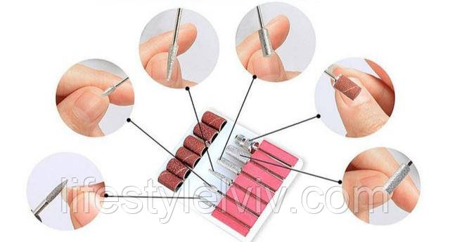 - У комплекті є підставка для ручки та набір насадок для роботи з кутикулою.