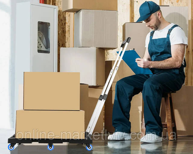 Платформа візка має збільшену площу, що забезпечує стійкість вантажу та запобігає його падінню під час руху. Шість коліс, 4 поворотні для маневреності, гарантують плавне пересування навіть на складних покриттях. Ергономічна ручка регулюється по висоті, забезпечуючи комфортне використання для людей будь-якого зростання.